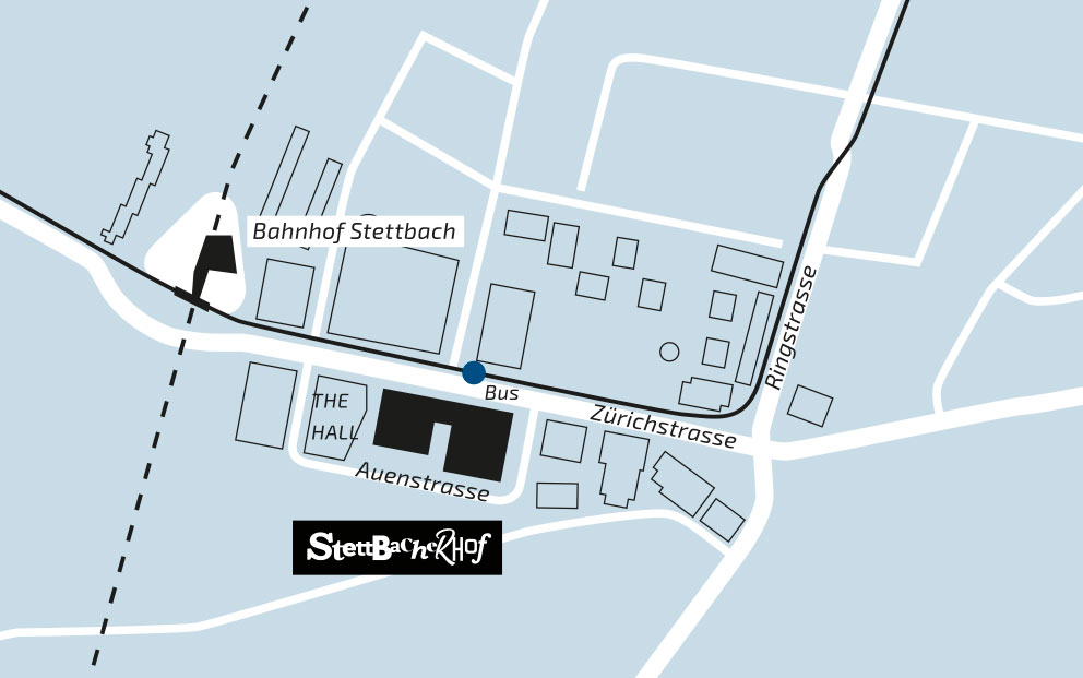 Der Bahnhof Stettbach ist ein wichtiger Verkehrsknotenpunkt auf der Grenze der Stadt Zürich zur Nachbargemeinde Dübendorf. Vom Stettbacherhof bis zum Bahnhof Stettbach mit seinen zahlreichen S-Bahn- und Tram-Verbindungen sind es zu Fuss nur 350 m. Den Hauptbahnhof Zürich erreichen Sie von dort mit der S-Bahn in rund 10 Minuten. Eine Bushaltestelle mit mehreren Buslinien nach Bahnhof Dübendorf, Zürich, Maur und Fällanden befindet sich ausserdem direkt vor dem Stettbacherhof.